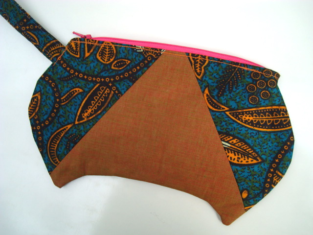 Description: Useful and fashionable wristlet made from Tanzanian cotton and scrap fabrics with a zipper and a strap. Lining inside. Exterior and interior are both interfaced to keep the shape. Originally designed and handcrafted by Sabaku. Approximate measurements: opening of the pouch: 18 cm (7.1 in); width of the widest part: 24 cm (9.4 in); height in the middle: 12 cm (4.7 in); strap: 26 cm (10.2 in).